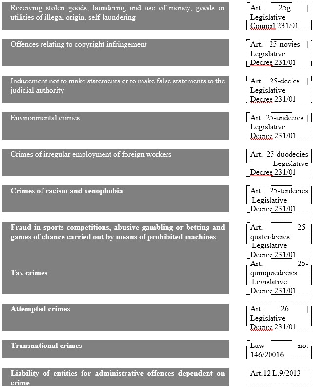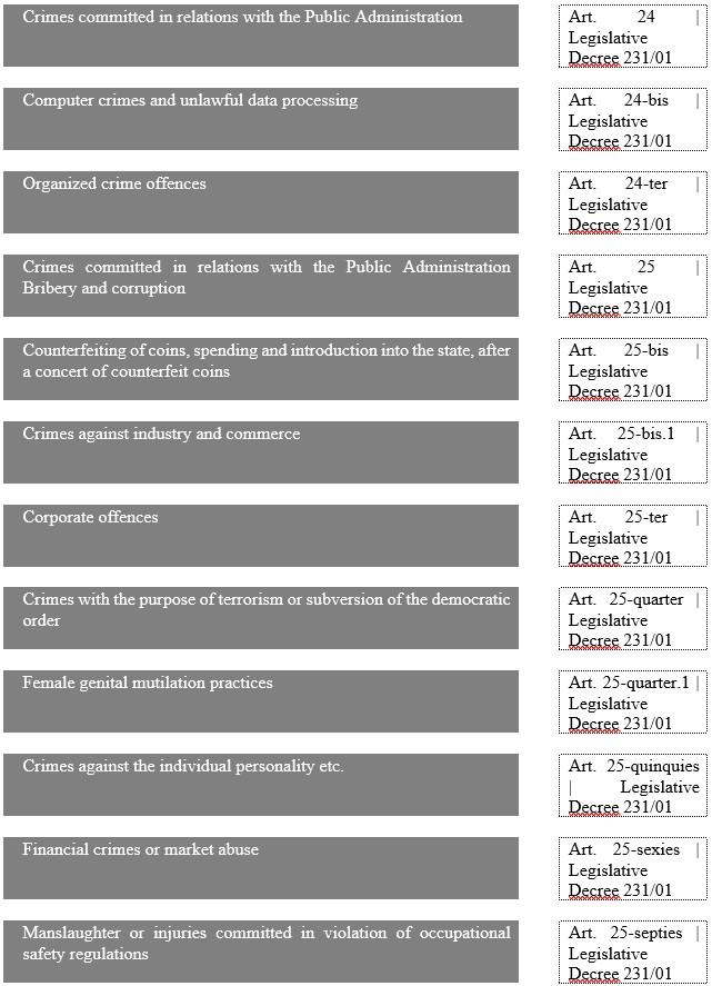 On the basis of the provisions of Legislative Decree 231/01 and subsequent additions – the administrative liability of the entity is configured with reference to the following types of crime: