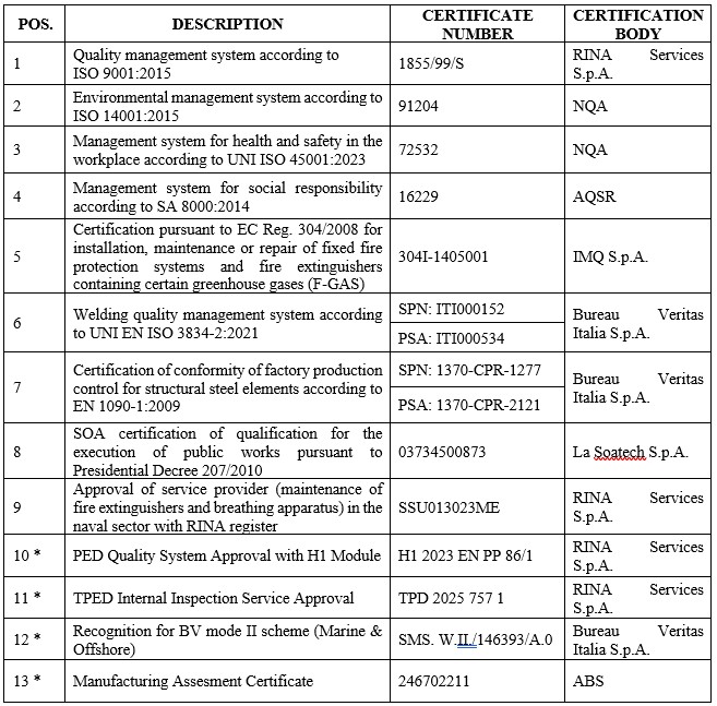 SA FIRE PROTECTION S.r.l. during its work activities has obtained various registrations in special registers, and is in possession of A.Q.A.P.120 qualification issued by NAVARM and AER-Q-120 issued by ARMAEREO.